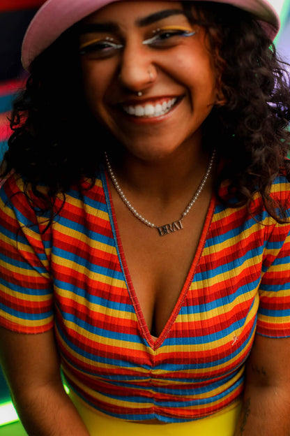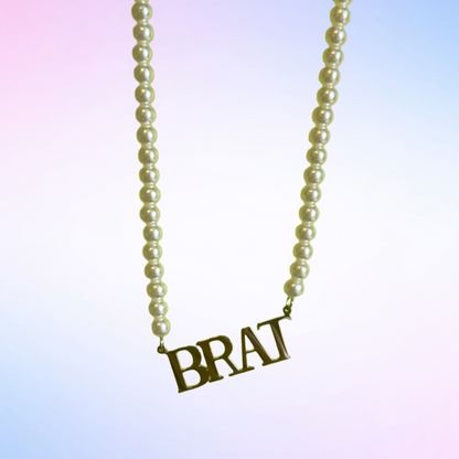 365 party girls, pull up! Necklace measures 16-18 inches and features faux pearls and nameplate and reads "BRAT" in all caps. Metal is a stainless steel. Nickel free & sensitive skin approved. 10% of this sale goes directly to supporting community organizations.