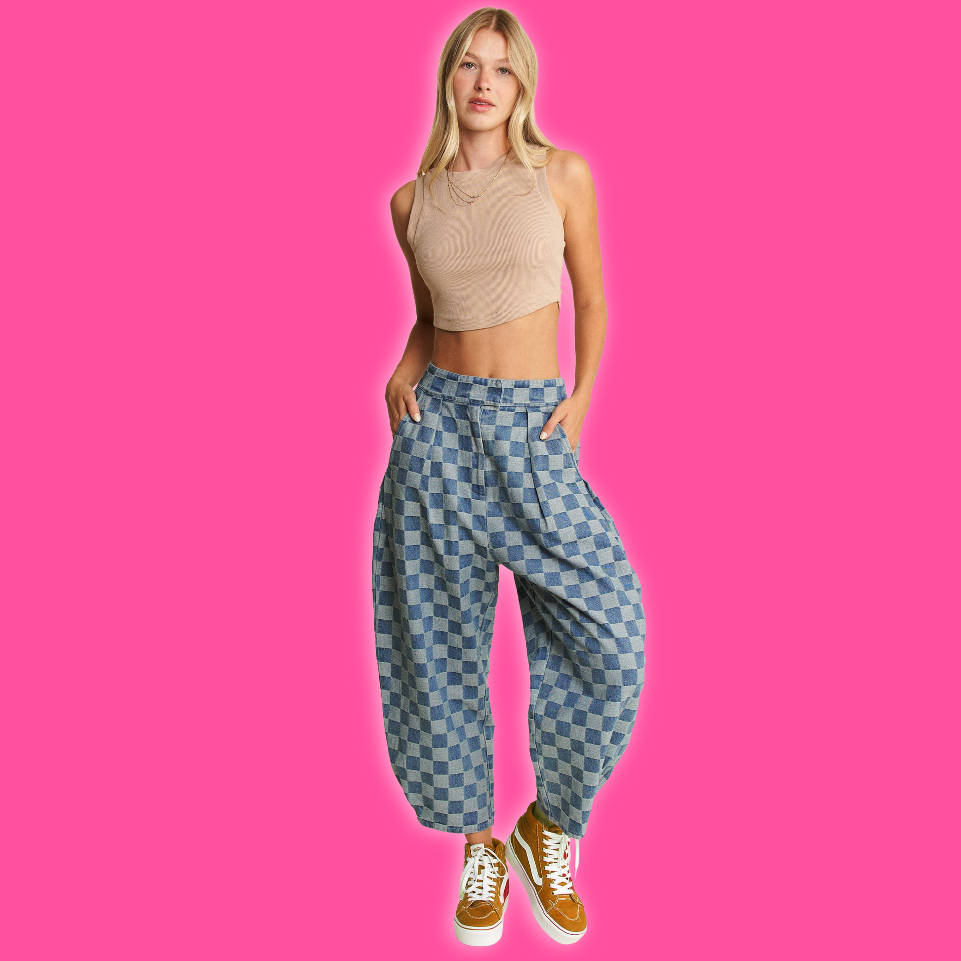 You can feel like such a sk8r boi in the MID-RISE BARREL PULL-ON CHECKERBOARD DENIM PANT.
